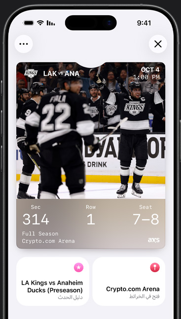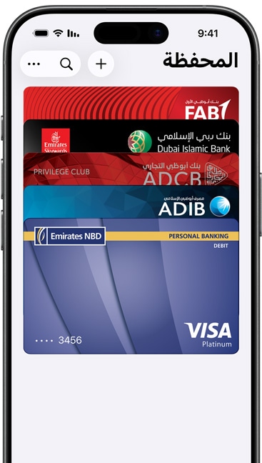• Apple لا تشارك أرقام بطاقاتك الفعلية مع التجار ولا تخزَّن على سيرفراتها إطلاقاً، فمعلومات بطاقاتك تُربط بكل أمان بحساب Apple الخاص بك لمساعدتك على إضافة بطاقاتك وتذاكرك وإدارتها عبر مختلف أجهزتك.