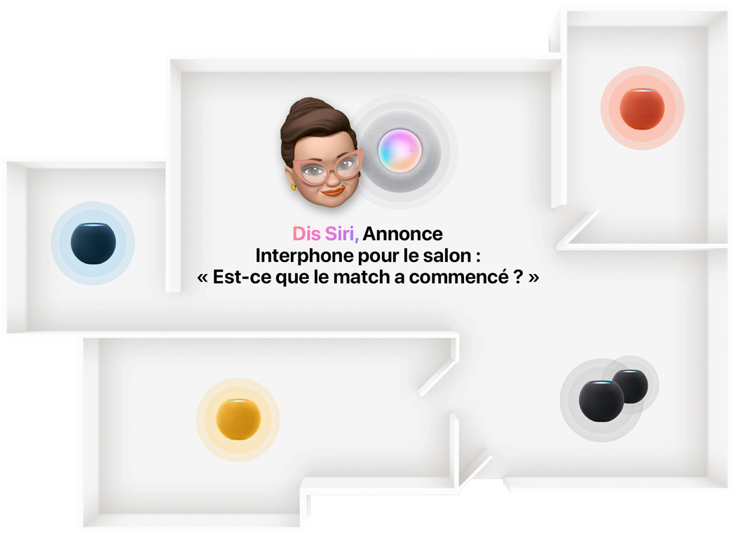 Avec plusieurs HomePod mini, vous pouvez facilement parler avec les autres membres de la famille d’un bout à l’autre de la maison, via les Annonces Interphone. Demandez à Siri de transmettre votre message partout, ou juste dans certaines pièces, et tout le monde pourra y répondre aisément.