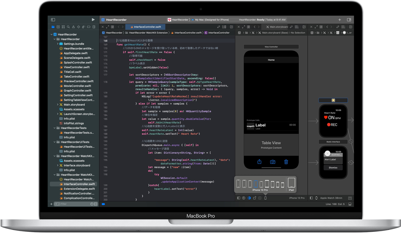 MacBook Pro. O Xcode e o Swift no Mac com HealthKit ajudam no desenvolvimento de um app para iOS e outro para watchOS que operam juntos para capturar e registrar em tempo real a frequência cardíaca e as reações físicas de estudantes durante atividades.