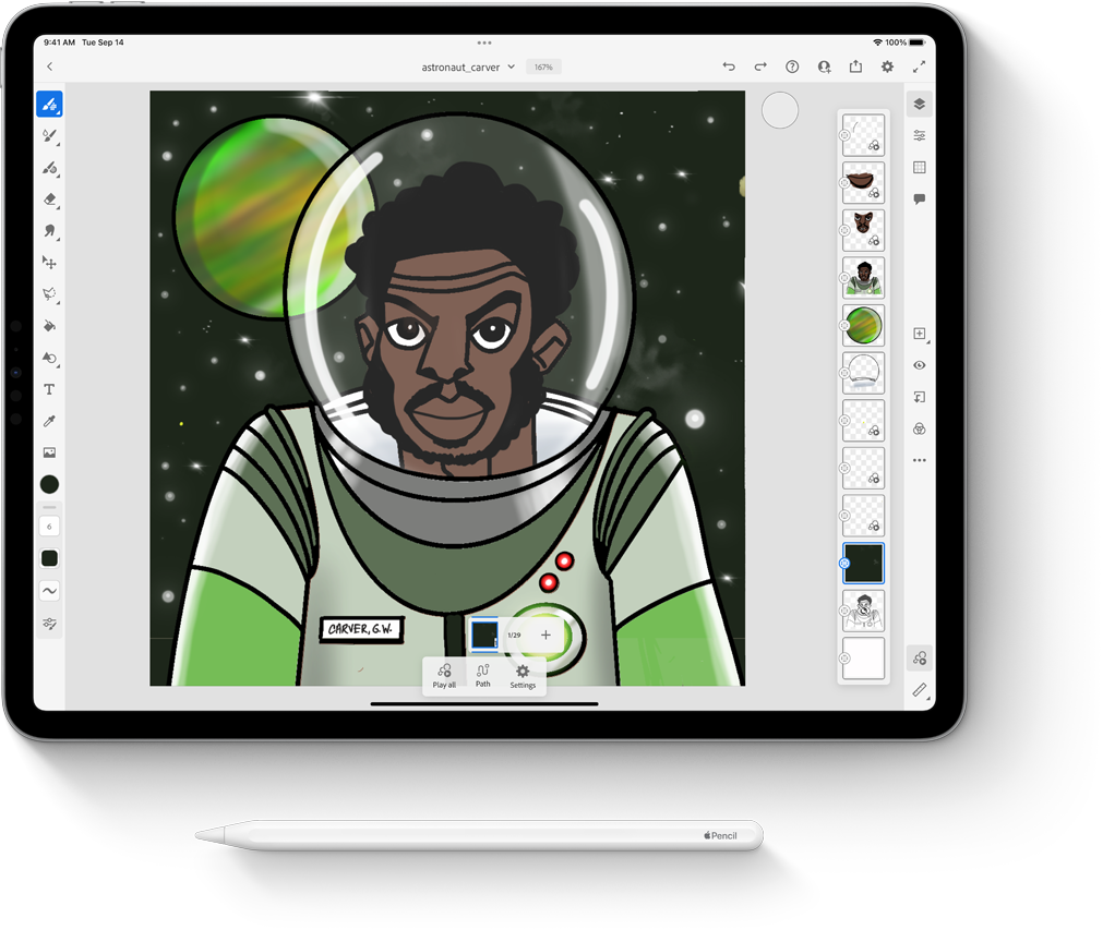 iPad Pro et Apple Pencil. Les technologies Apple sous-tendent la toile numérique d’Ajuan. Si la polyvalence d’iPad est idéale pour illustrer, présenter et enseigner, la précision et la prise en main naturelle de l’Apple Pencil font qu’il est facile de montrer comment peindre et dessiner des personnages inspirants dans Adobe Fresco.