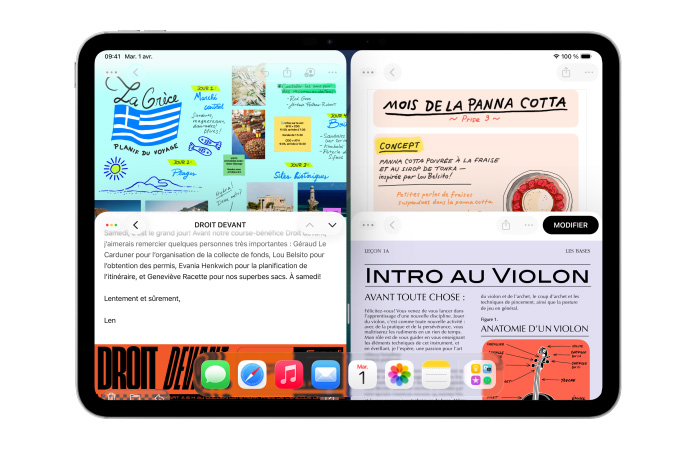 Un bref geste vers la gauche ou la droite vous permet de changer la disposition de vos fenêtres. Et il est maintenant possible de diviser l’écran de votre iPad en tiers ou en quarts.