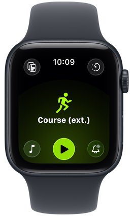 Quatre boutons en coin facilitent l’accès aux fonctionnalités prisées, comme Rythme, Course contre soi-même, Entraînement personnalisé et Workout Buddy.