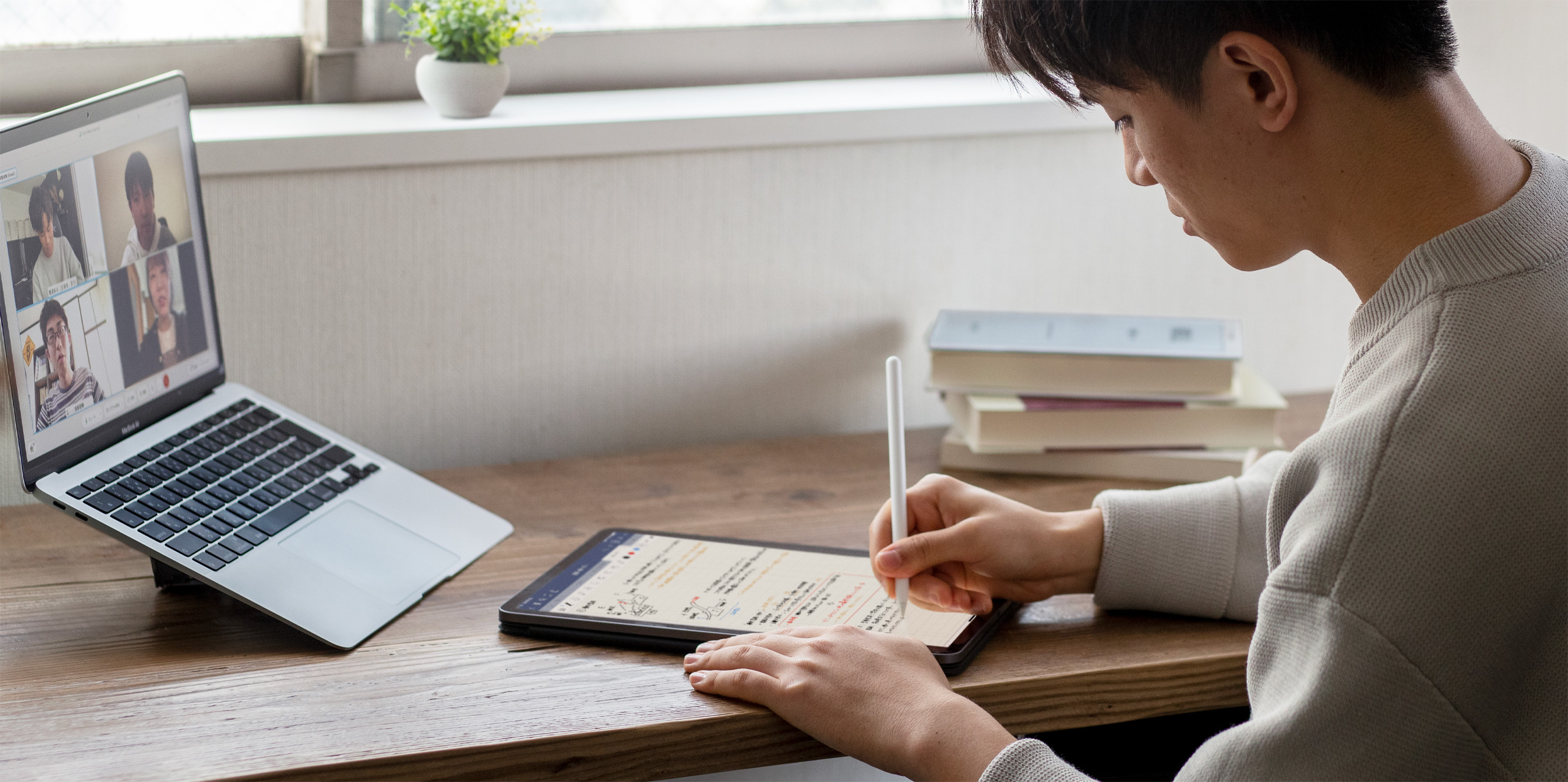 Wie viele andere Studierende hat sich auch Takuto an das Lernen zu Hause gewöhnt, indem er die Vorteile modernster Technologie nutzte. Bei Online-Vorlesungen verwendete er Split Screen auf dem iPad, um auf der einen Seite des Bildschirms die Präsentationen der Professor:innen zu sehen und auf der anderen Notizen zu machen. Und in virtuellen Lerngruppen nutzte er FaceTime auf dem Mac, um sich mit Kommiliton:innen auszutauschen, während er Gruppenprojekte auf der immersiven Oberfläche des iPad festhielt.