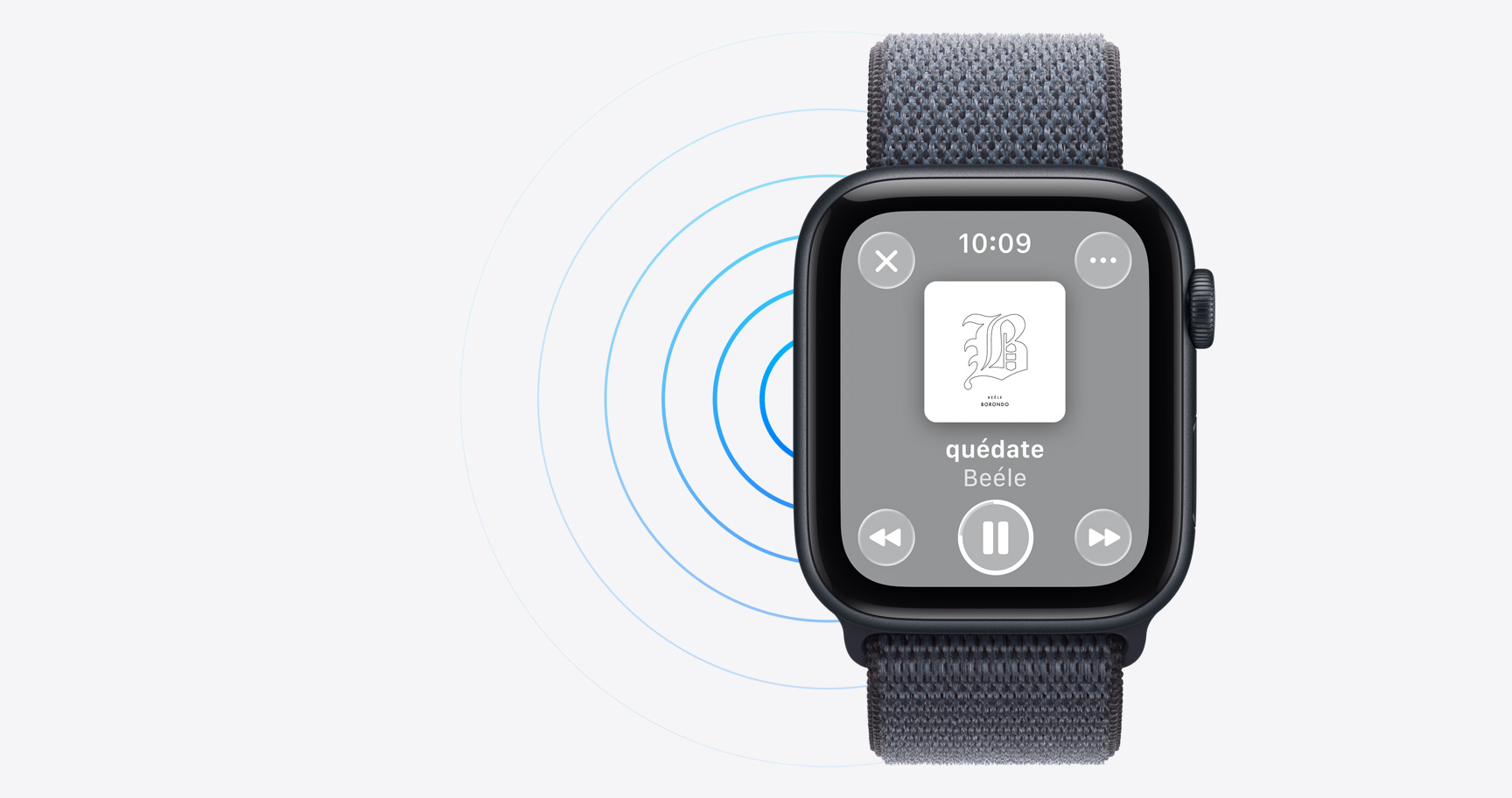 El Apple Watch SE 3 se conecta fácilmente a tus AirPods para que escuches música, audiolibros o podcasts sin usar las manos.6 Y si no llevas tus AirPods contigo, puedes reproducir audio directamente desde el parlante de tu reloj.