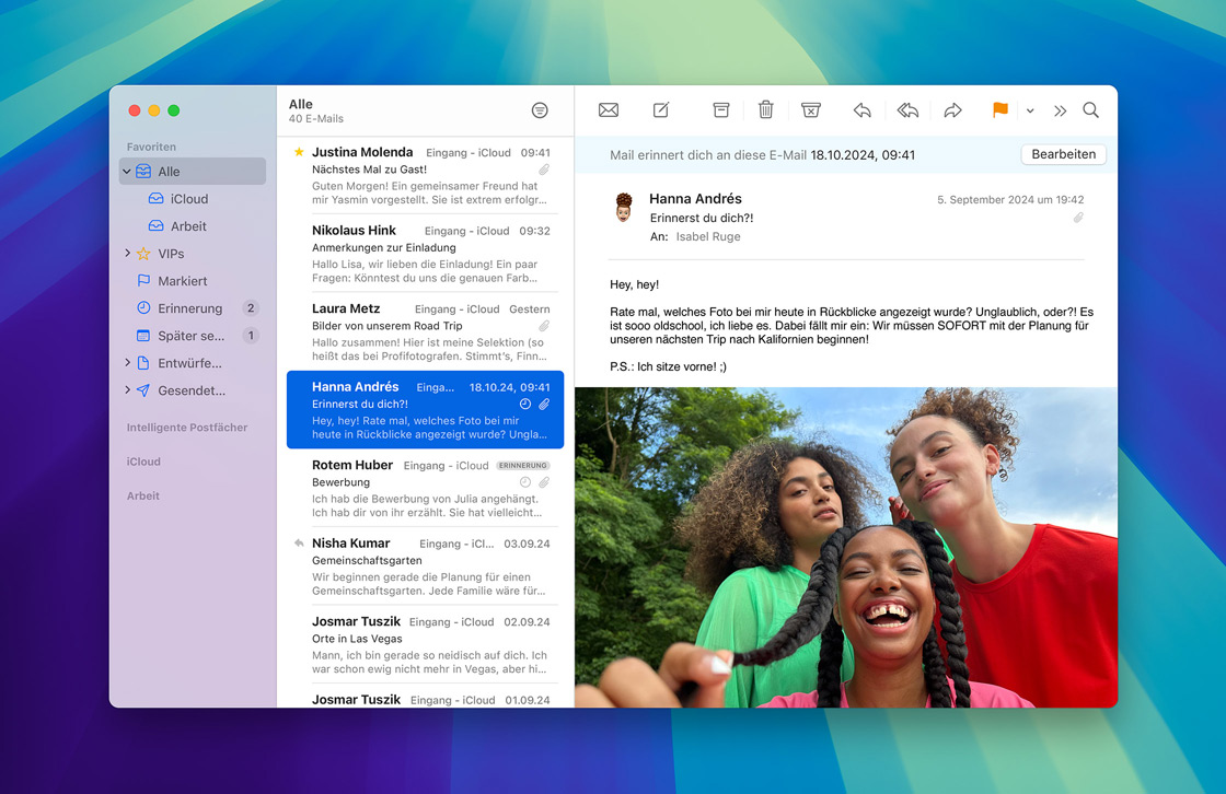 iCloud Mail ist nahtlos in die Mail App auf deinem iPhone, iPad oder Mac integriert und iCloud.com macht es einfach, von überall E‑Mails zu senden und zu empfangen. Sicherheitsfeatures wie Schutz vor Spam und Antiphishing sind integriert, um Spam Mails zu erkennen und zu blockieren, bevor sie in deinem Posteingang landen. Du kannst deine eigene @icloud.com E‑Mail Adresse ganz einfach einrichten. Mit einem iCloud+ Abo kannst du deine E‑Mail mit einer eigenen Domain personalisieren.