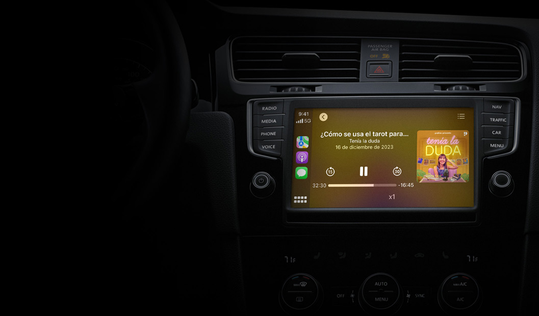 CarPlay te permite escuchar fácilmente el contenido de tu iPhone en el coche para que tengas la misma experiencia de uso con los botones integrados.2 Incluso puedes pedirle a Siri que te ponga el último episodio o controlar la reproducción con la voz. Y la app Apple Podcasts ya viene preinstalada en algunos modelos.