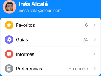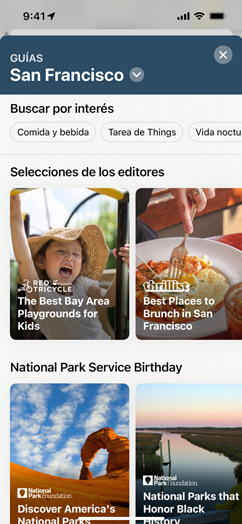• Las guías seleccionadas son listas de lugares creadas por socios de confianza para ayudarte a encontrar sitios interesantes a los que ir a comer, comprar, quedar con amigos o, sencillamente, explorar. Mapas ofrece más de 1.000 guías seleccionadas en ciudades de todo el mundo. En iOS 15, toca Explorar Guías en Mapas para ver las guías recomendadas por los editores.