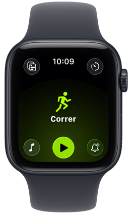 Explorar el Apple Watch Tres modelos de Apple Watch: el del centro, en color natural, muestra el entreno Correr iniciado con datos de frecuencia cardiaca; el de la derecha, en negro azabache, muestra un Genmoji, y el de la izquierda, en oro rosa, muestra la app Constantes Vitales