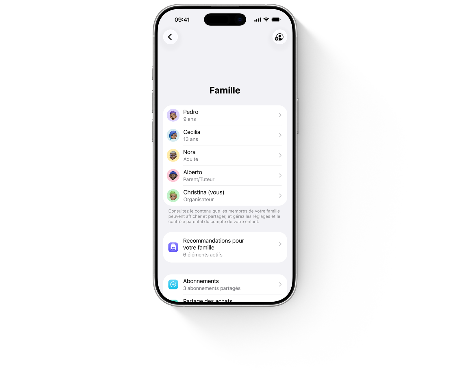 Découvrez nos conseils et nos idées d’utilisation des fonctionnalités familiales. Ouvrez Réglages, touchez votre nom, Famille, puis Recommandations pour votre famille.