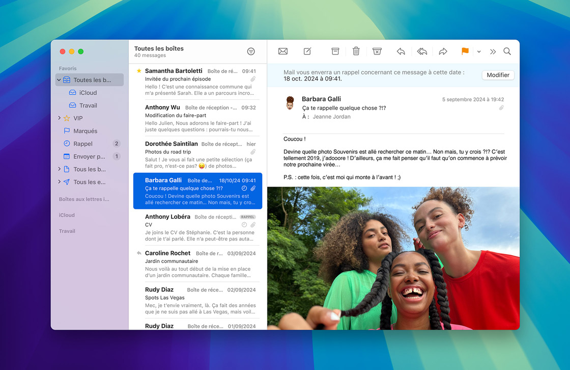 Mail iCloud est parfaitement intégré à l’app Mail de votre iPhone, iPad ou Mac, et iCloud.com simplifie l’envoi et la réception d’e‑mails de n’importe où. Des fonctionnalités de sécurité, telles que des protections contre le spam et le phishing, sont intégrées pour détecter les courriers indésirables et y faire barrage avant qu’ils n’atteignent votre boîte de réception. Il est facile de configurer votre propre adresse e‑mail @icloud.com, et lorsque vous vous abonnez à iCloud+, vous avez la possibilité d’attribuer à votre adresse e‑mail un nom de domaine personnalisé.
