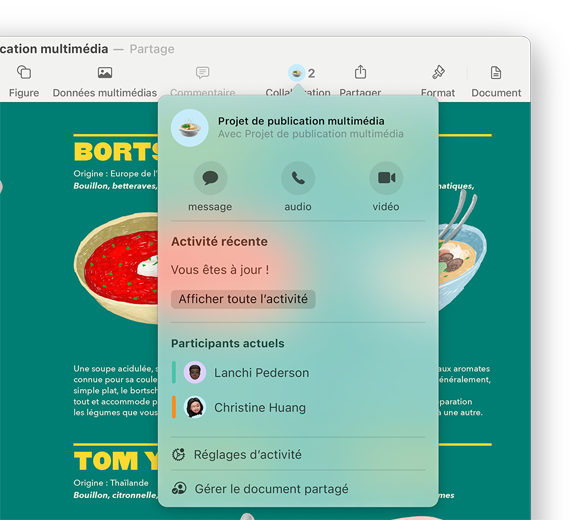 Collaborez et partagez facilement vos fichiers, dossiers, documents et autres contenus lorsque vous êtes en déplacement. Il vous suffit d’envoyer un lien privé et de choisir qui peut afficher, partager ou modifier le projet. Et grâce aux actualisations en temps réel, vous pouvez voir les changements s’opérer en direct.