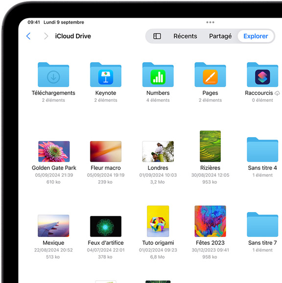 Sur iCloud Drive, vos fichiers et dossiers enregistrés sont faciles d’accès et simples à partager, quel que soit l’appareil que vous utilisez. Tous sont accessibles depuis l’app Fichiers sur iOS et iPadOS, le Finder de votre Mac, l’Explorateur de fichiers sur les PC Windows, ou encore sur iCloud.com.