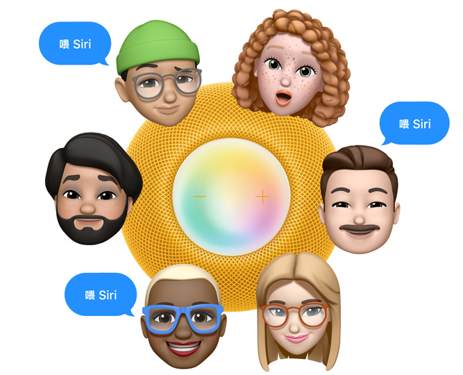 俯視一部黃色 HomePod mini,有 6 個不同的 Memoji 面孔包圍著它,其中 3 個人旁邊有藍色說話泡泡,他們說「喂 Siri」