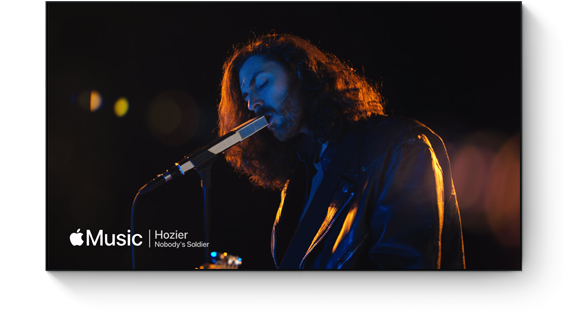 一部平面電視展示 Apple TV 節目和電影、Apple Music 及 Apple Fitness+ 的靜態影像。