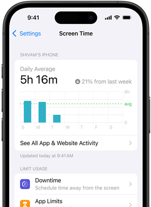 Screen Time gives you a better understanding of the time you and your kids spend using apps, visiting websites and on your devices overall. You can get weekly reports or see specific app usage, notifications and device pickups.