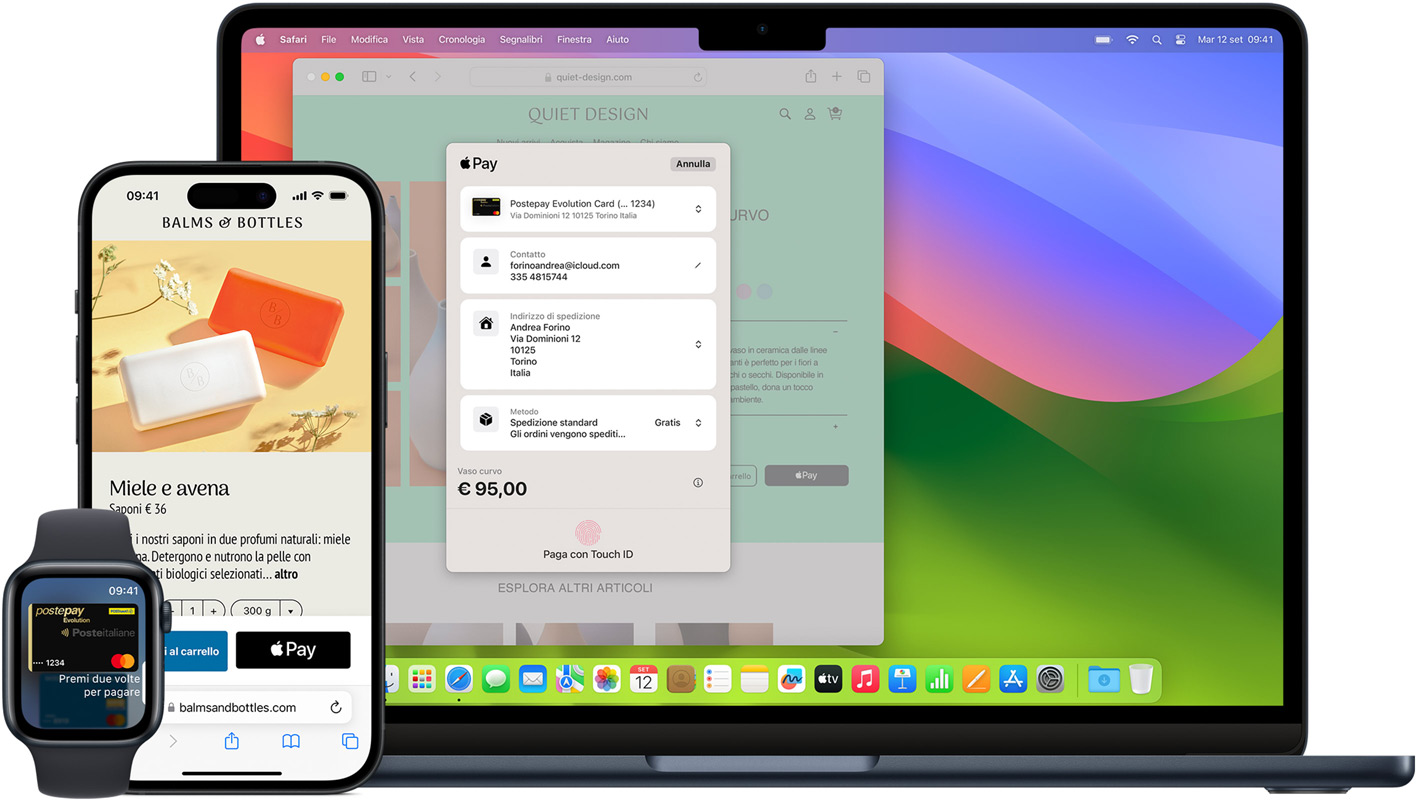 Nelle app e online. Su iPhone, iPad, Mac e non solo, usa Apple Pay per pagare comodamente i tuoi acquisti in Safari e altri browser, senza dover compilare moduli interminabili. Se sei su un dispositivo Apple, clicca o fai tap sul pulsante Apple Pay e paga con un tocco o con uno sguardo. Se invece non sei su un dispositivo Apple, inquadra il codice Apple Pay con la fotocamera del tuo iPhone e usa l’iPhone per completare l’acquisto.1 Con Apple Pay puoi anche abbonarti a servizi come Apple Music e Apple TV, acquistare app e giochi sull’App Store e aggiungere spazio di archiviazione su iCloud.