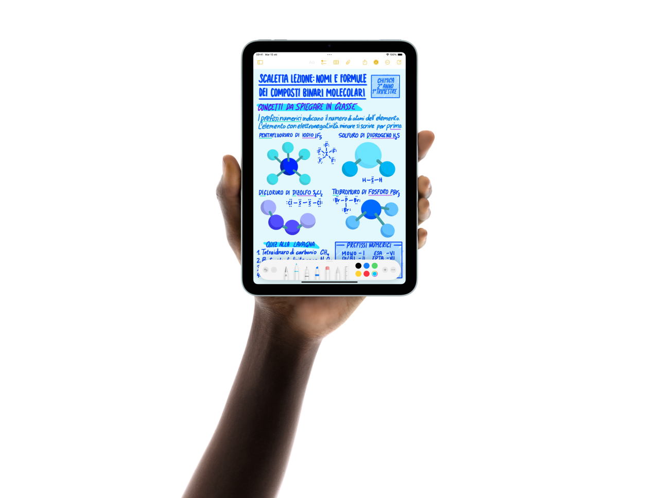 Cinque iPad mini disposti a ventaglio sorretti da una mano. Uno mostra la fotocamera posteriore, gli altri quattro sono visti di fronte. Una Apple Pencil Pro viene usata per prendere appunti.