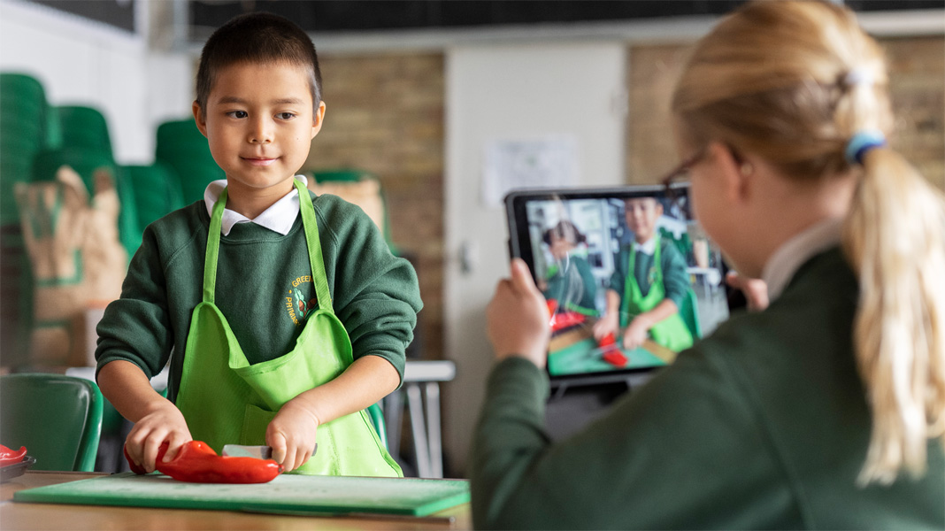 調理室で生徒たちは、メモアプリでレシピを確認し、iMovieを使って調理方法をビデオにまとめ、Keynoteで栄養成分表示ラベルを作成しています。菜園では、栄養豊富な作物の育て方を学ぶために土壌サンプルの試験を行い、その結果をNumbersに記録しています。さらには、英国各地の農家とFaceTimeで交流し、持続可能な方法を活用した大規模な農作についても学んでい