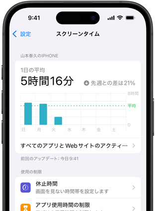 スクリーンタイムは、あなたとあなたの子どもたちがアプリを使ったりウェブサイトを見ている時間や、デバイスの全体的な利用時間について、あなたがより良く理解できるようにします。週単位のレポートを見ることも、特定のアプリの使用状況、通知の頻度や回数、デバイスを手に取った回数を見ることもできます。