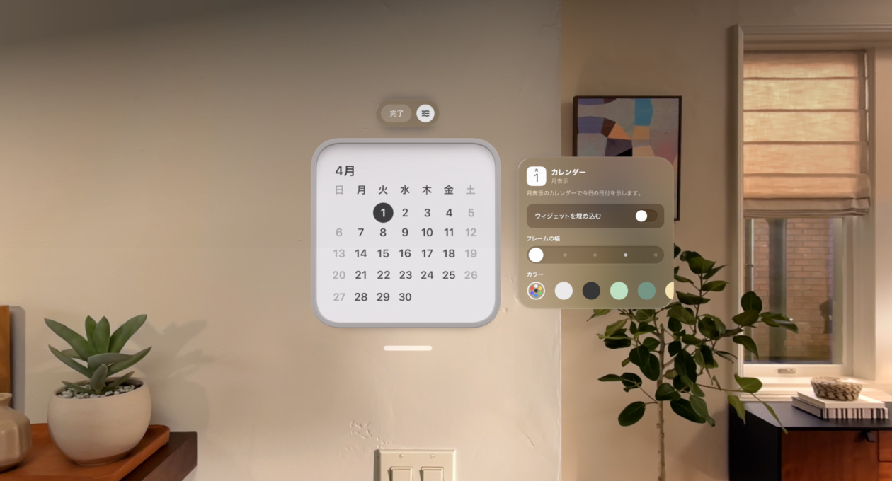 写真、時計、ミュージック、カレンダーなど、お気に入りのウィジェットを一目で確認できる位置に置いておけます。フレームの厚み、色、奥行きをカスタマイズするのも簡単です。Apple Vision Proを装着するたびに、あなたの理想の空間が広がります。
