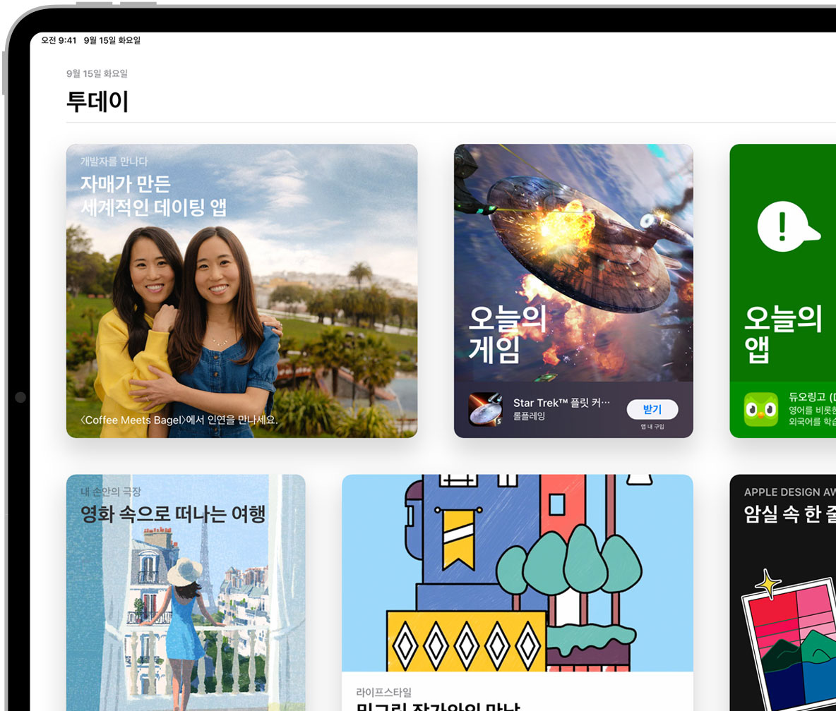 10년이 넘는 시간 동안 App Store는 새로운 앱을 발견하고 다운로드할 수 있는, 신뢰할 만한 안전한 공간이라는 사실을 증명해왔습니다. 그러나 App Store는 단순한 스토어만이 아닙니다. 방문자에게 탁월한 경험을 제공하는 것을 목적으로 하는 혁신의 집약체죠. 물론 이러한 경험의 대부분은 우리가 제공하는 앱들이 개인정보 보호, 보안 및 콘텐츠에 대한 가장 엄격한 기준을 충족할 때 비로소 보장됩니다. 그래서 우리는 이 부분에 대해서도 최선을 다하죠. App Store의 모든 요소는 당신이 마음에 드는 새로운 앱을 믿고 찾을 수 있도록 설계되었습니다.
