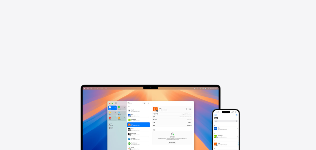 ‘암호’ 앱은 계정 암호, 패스키, Wi‑Fi 비밀번호, 인증 코드를 모두 한곳에서 확인할 수 있게 해줍니다. iCloud를 통해 기기 간