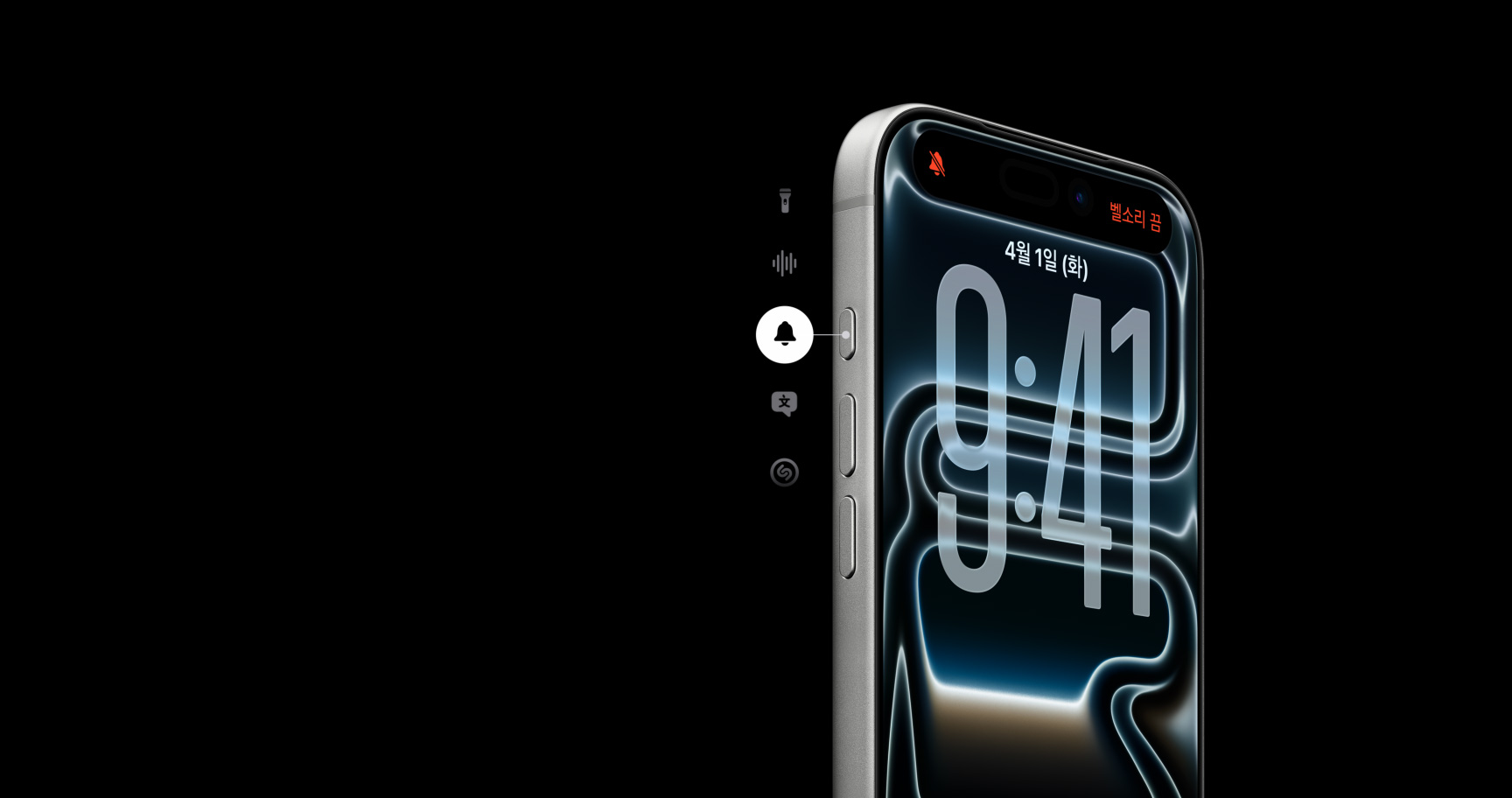 동작 버튼. 즐겨 쓰는 기능을 위한 맞춤형 지름길. 길게 눌러 ‘무음 모드’, ‘번역’, ‘단축어’ 등 원하는 동작 실행 가능.