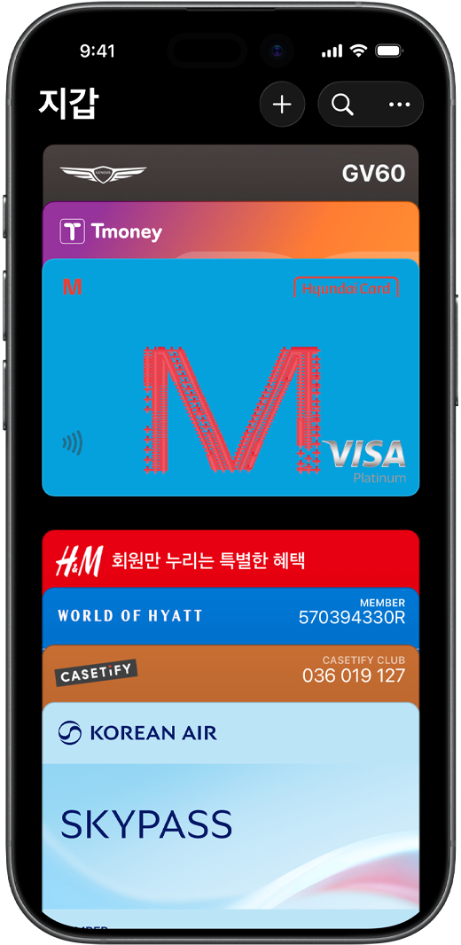 iPhone 및 Apple Watch용 앱인 Apple 지갑은 신용카드와 체크카드, 교통패스, 탑승권, 티켓, 키, 주문 추적 세부 정보, 포인트 카드 등을 전부 한 곳에 안전하고 편리하게 보관할 수 있게 해줍니다.