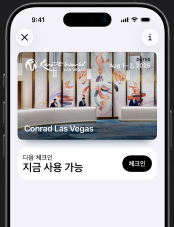 이제 일부 호텔의 경우, 예약을 완료한 뒤 호텔 키를 지갑 앱에 바로 추가해둘 수 있습니다. 그러면 로비에 들를 필요 없이 폰에서 바로 체크인을 마치고 방에 들어갈 수 있죠.4 수영장, 피트니스 클럽, 비즈니스 센터 등 각종 시설에 출입할 때도 iPhone이나 Apple Watch를 사용하면 된답니다. 그리고 예약을 변경하거나 숙박 기간을 연장하면 키도 실시간으로 업데이트됩니다. 동일 브랜드 호텔에 묵은 적이 있다면, 나중에 다시 방문할 때도 이전에 지갑 앱에 추가해두었던 키를 이용해 체크인하고 방에 출입할 수 있습니다.