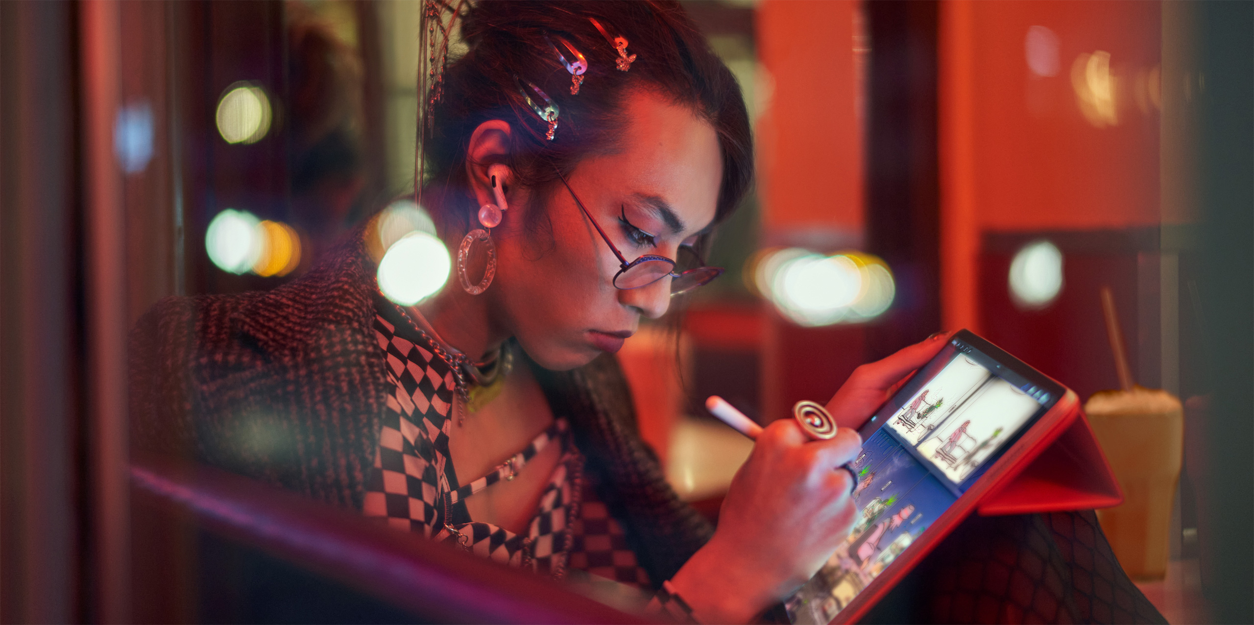 “Me gusta tener distintos tamaños de pantallas para cada nivel de interacción”, comenta Lim-Chan, que usa la MacBook con Photoshop para diseñar y el iPad con Procreate para ilustrar y hacer bocetos. “Y gracias a la velocidad de respuesta y comodidad del Apple Pencil, no extraño para nada el lápiz y el papel“.