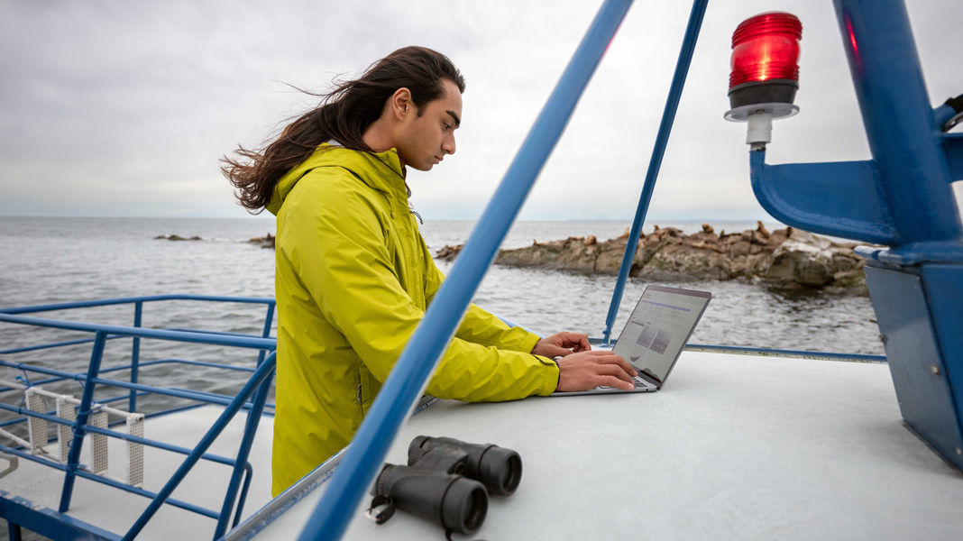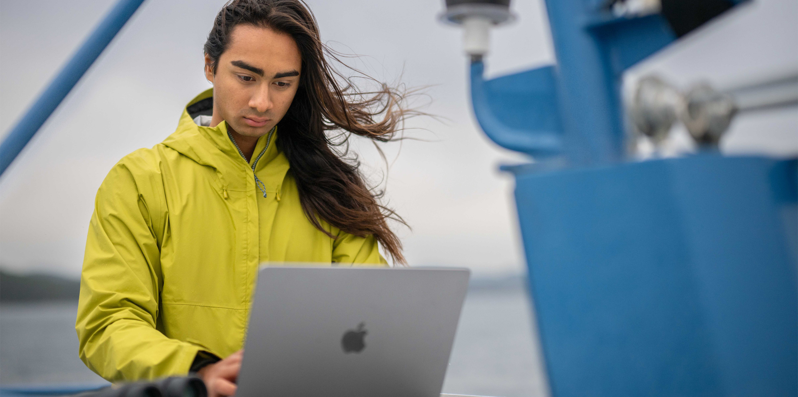 La tecnología de Apple también ayuda a Bodhi a realizar y sintetizar sus investigaciones universitarias, como ilustrar los impactos de las actividades de los buques marinos sobre la población de orcas residentes del sur, una especie en peligro de extinción presente en el mar de los Salish. Con la MacBook Air, el iPhone y unos binoculares, realiza todo el trabajo de campo mar adentro. Registra los avistamientos de ballenas en Numbers y Keynote para crear diagramas de flujo y mapas de densidad que muestran dónde se cruzan con las rutas populares de ferris, lo que ayuda a identificar posibles interferencias con las poblaciones de ballenas de la región. Y con el iPhone, toma fotos y graba videos para documentar todos sus hallazgos.