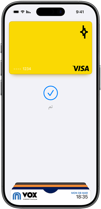 قم بإعدادها على iPhone، بثوان معدودة. تأتي Apple Pay مدمجة في iPhone وApple Watch وMac وiPad. افتح تطبيق المحفظة في iPhone وانقر على علامة زائد للبدء. ثم أضف بطاقة ائتمان أو سحب بالنقر على الجزء الخلفي من جهازك iPhone مستخدماً بطاقتك المؤهلة.1 سيكون لديك خيار إضافة بطاقتك إلى أجهزتك الأخرى في الوقت نفسه. ولتسديد ثمن مشترياتك، اضغط مرتين ثم مرر للدفع وانطلق. وسيظل بإمكانك الحصول على المكافآت والمزايا التي تقدمها بطاقتك، ولن تخسر النقاط أو الأميال.