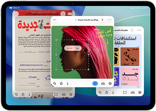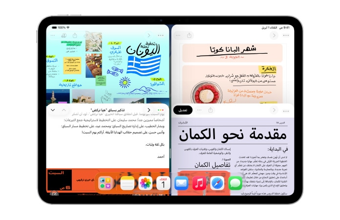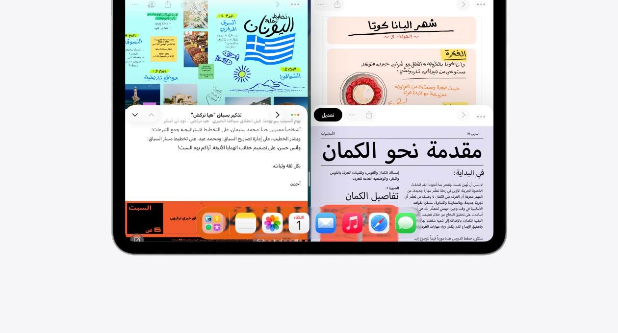 رتّب النوافذ بحركة بسيطة من إصبعك إلى اليسار أو اليمين. والآن يمكنك أيضاً تقسيم شاشة iPad إلى ثلاثة أو أربعة أجزاء.