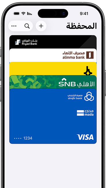 • Apple لا تشارك أرقام بطاقاتك الفعلية مع التجار ولا تخزَّن على سيرفراتها إطلاقاً، فمعلومات بطاقاتك تُربط بكل أمان بحساب Apple الخاص بك لمساعدتك على إضافة بطاقاتك وتذاكرك وإدارتها عبر مختلف أجهزتك.