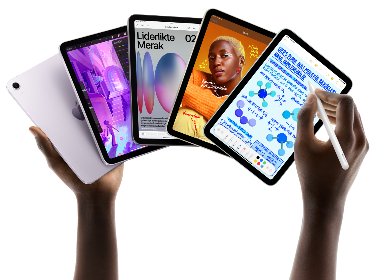 Hem yatay hem de dikey pozisyonda bir çok iPad mini modelinde İşaretleme, Hesap Makinesi, Kitaplar, iPad için Logic Pro, ForeFlight, Notlar, Zinnia, Procreate, Adobe Lightroom ve Infinity Nikki gibi uygulamalar gösteriliyor.Hem yatay hem de dikey pozisyondaki birden çok iPad mini modelinde Hesap Makinesi, Kitaplar, ForeFlight, Procreate ve Adobe Lightroom gibi uygulamalar gösteriliyor.
