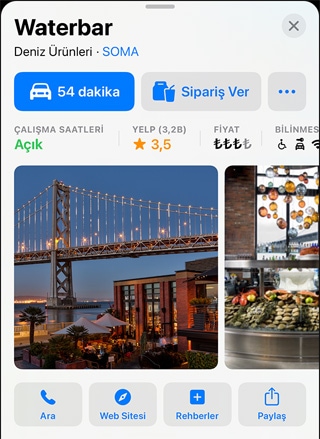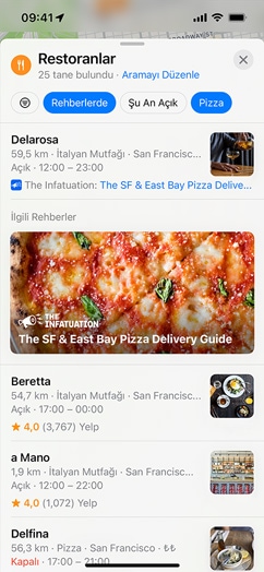 • Özel Düzenlenmiş Rehberler, yemek yemek, alışveriş yapmak, arkadaşlarla buluşmak veya sadece keşfetmek için harika yerler bulmanıza yardımcı olmak amacıyla güvenilir iş ortakları tarafından hazırlanan yer listeleridir. Harita’da dünya çapında birçok şehir için 1000’den fazla özel düzenlenmiş rehber sunulmaktadır. iOS 15’te Harita’yı açıp Rehberleri Keşfet’e dokunarak Harita editörlerinin tavsiye ettiği Rehberler'i inceleyebilirsiniz.