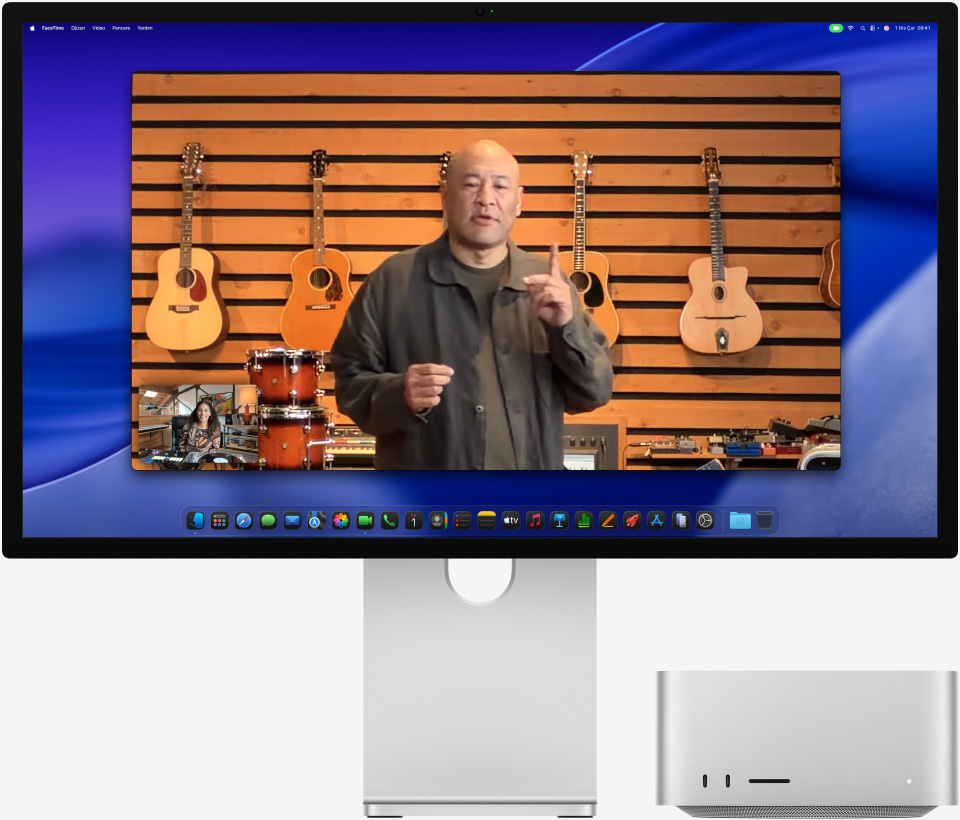 Studio Display XDR, etkileyici görüntü kalitesi ve loş ışık performansı sunan 12 MP Center Stage kameraya sahip. Hareket ettiğinizde veya bulunduğunuz kadraja başkaları girdiğinde bile odak hep sizde kalıyor. Masa Görüntüsü ile hem ekranda kalmayı sürdürüyorsunuz hem de çalışma alanınızın üstten görünümünü paylaşabiliyorsunuz. Kenar Işığı ise ekranınızın kenarlarında sanal bir halka ışık oluşturarak yüzünüzü aydınlatıyor.