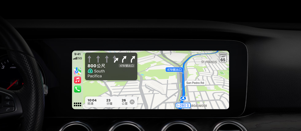開車時,你也能透過 CarPlay 體驗「地圖」的強大功能與簡潔易用。它可以根據電子郵件、文字簡訊、聯絡人和行事曆上的地址等已儲存在裝置上的資料,作出智慧建議。透過詳盡的地圖和轉向導航路線語音指引,更輕輕鬆鬆就能抵達你的下個目的地。